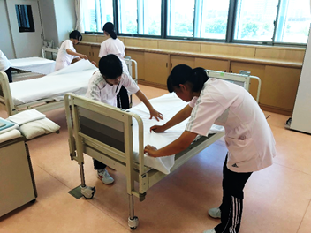 写真は1年生の初めに学習するベッドメイキングの様子です